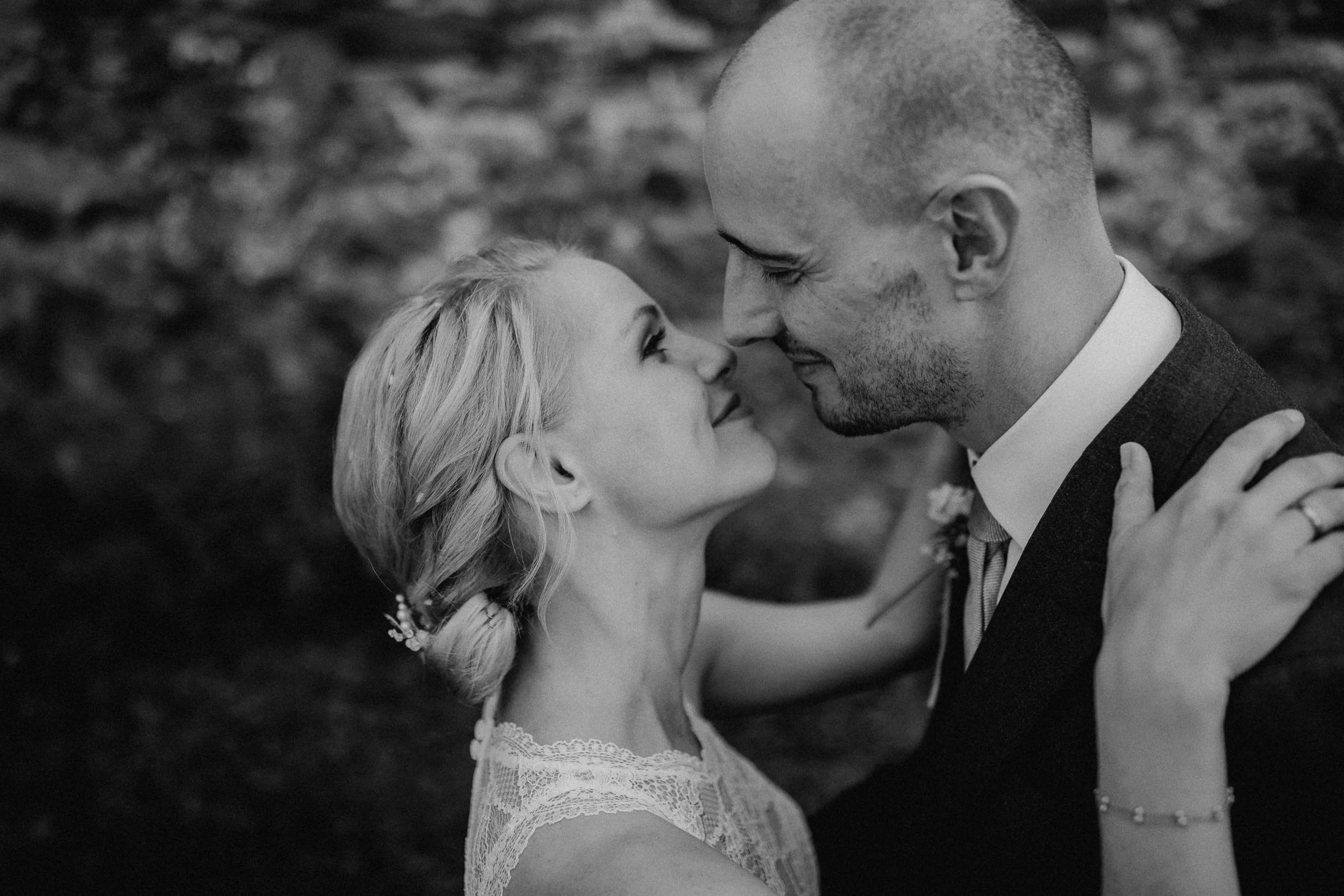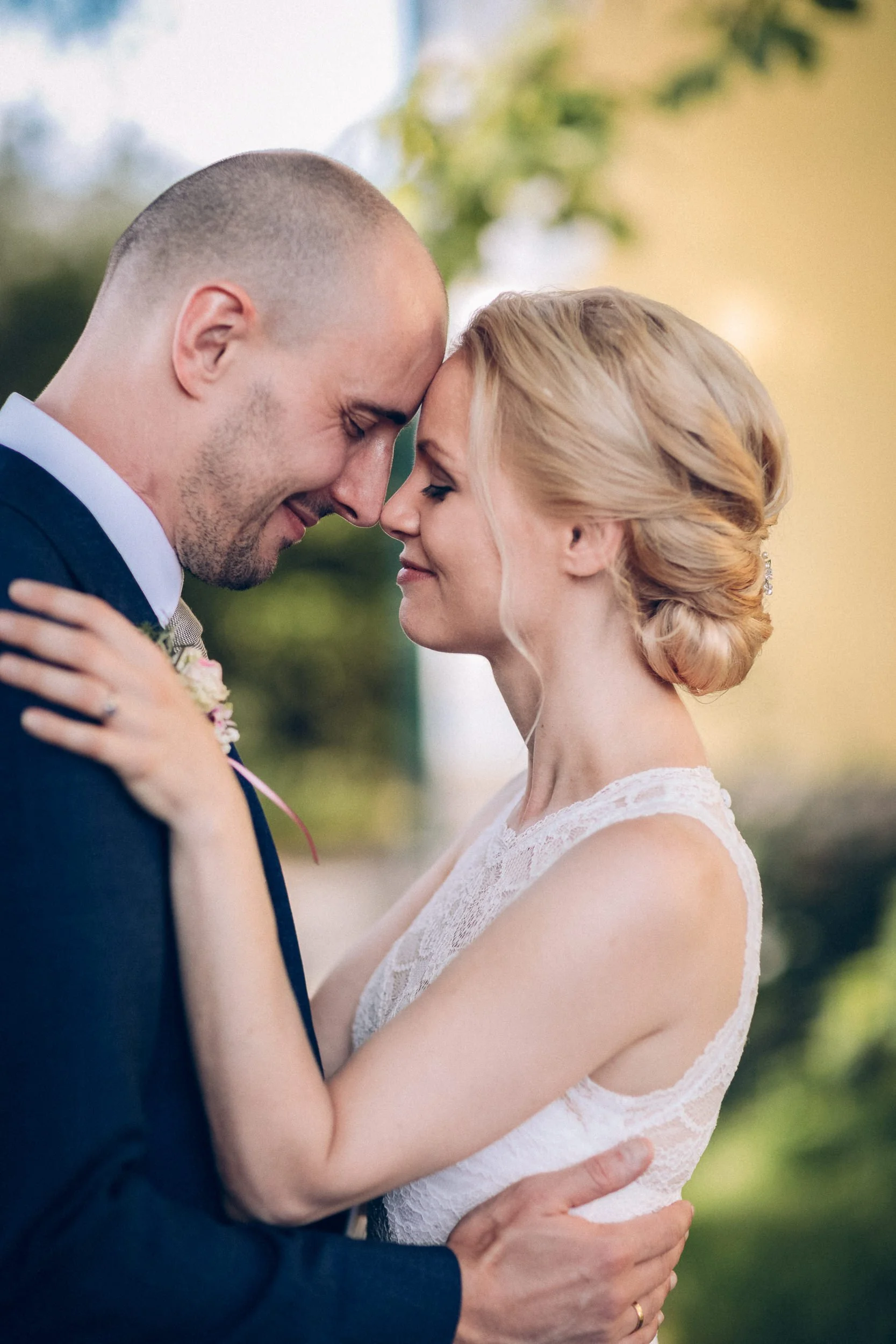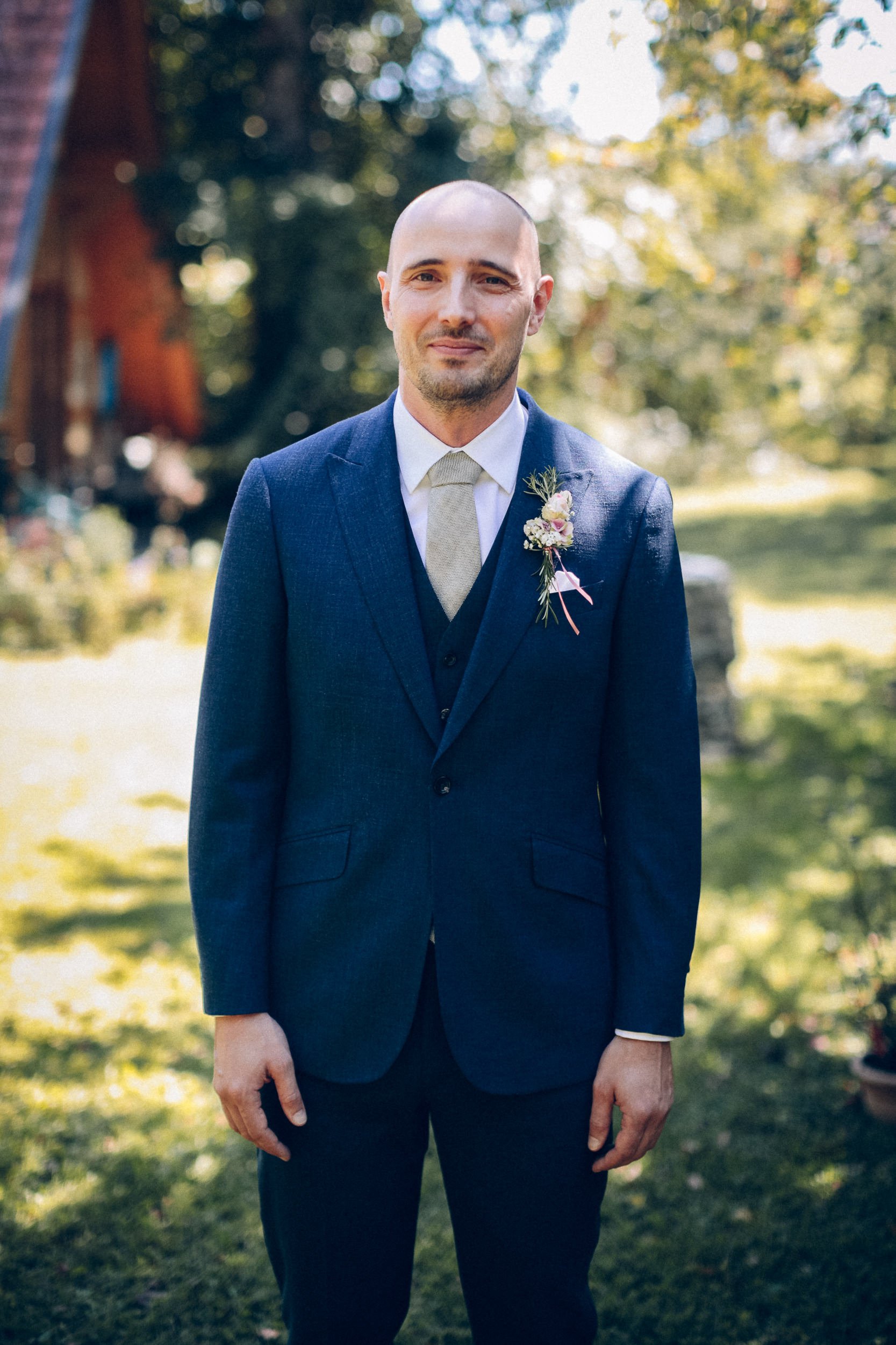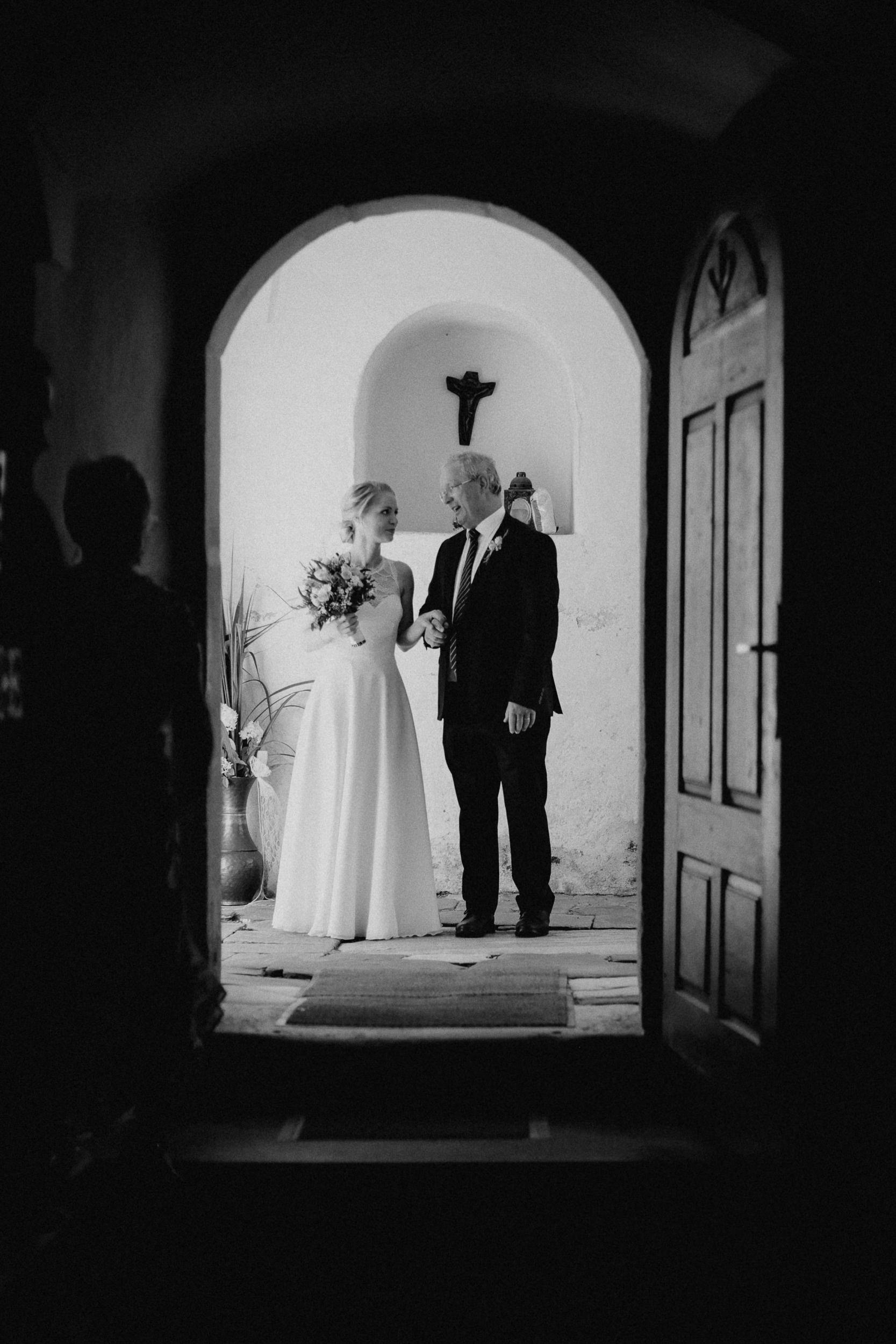 Auf geht’s um Brautstyling: Lockenwickler rein, Trockenhaube, es folgt kunstvolles Drapieren echter und unechter Haare. Das Ergebnis kann sich sehen lassen! Wieder zurück im idyllischen Dorf der Trauung: Braut und Bräutigam schlüpfen in die Outfits. Alle Knöpfe gehen zu – ein Erfolgserlebnis! Und schon geht es zum „First Look“ im romantischen Garten. Ein besonderer Moment abseits der Gäste, die bereits eintrudeln und auf der Sonnenterrasse einen Aperitif zu beschwingter Bläsermusik nehmen. Auch das Brautpaar gesellt sich schon vor der kirchlichen Trauung dazu. Nicht alltäglich, aber eine gute Idee! Es entspannt ein wenig vor dem großen Auftritt in der Kirche und lässt Braut und Bräutigam an der schönen Stimmung teilhaben.