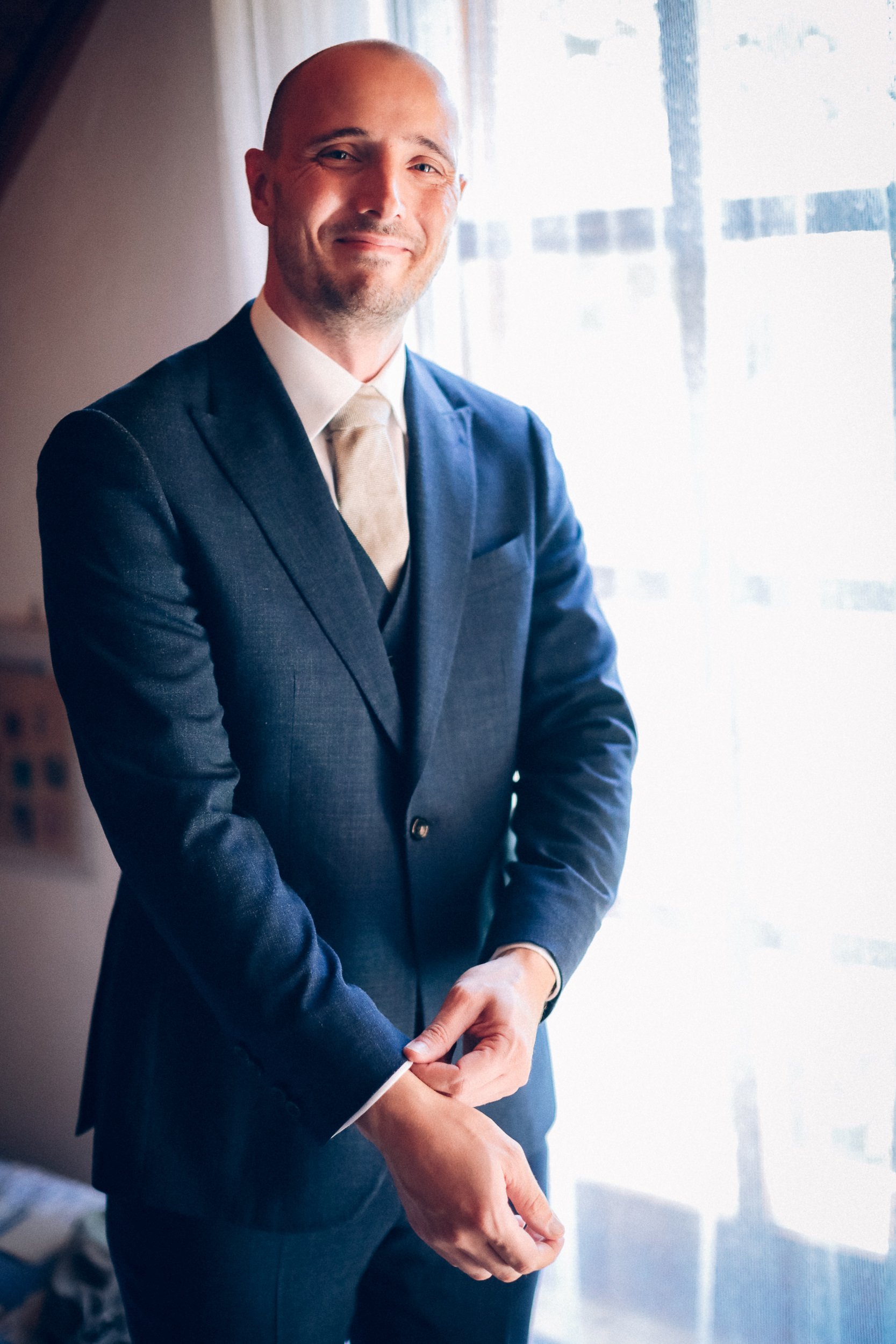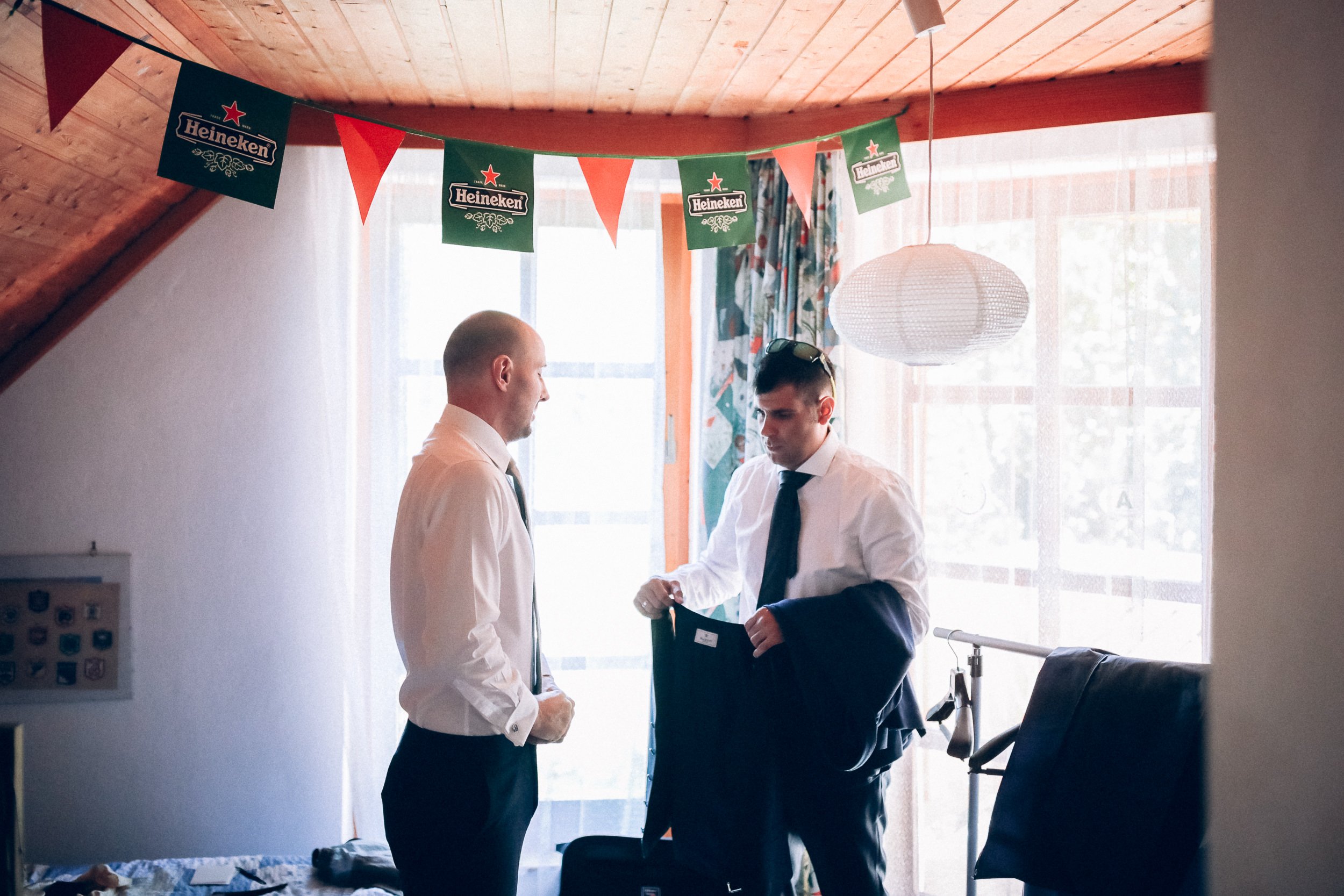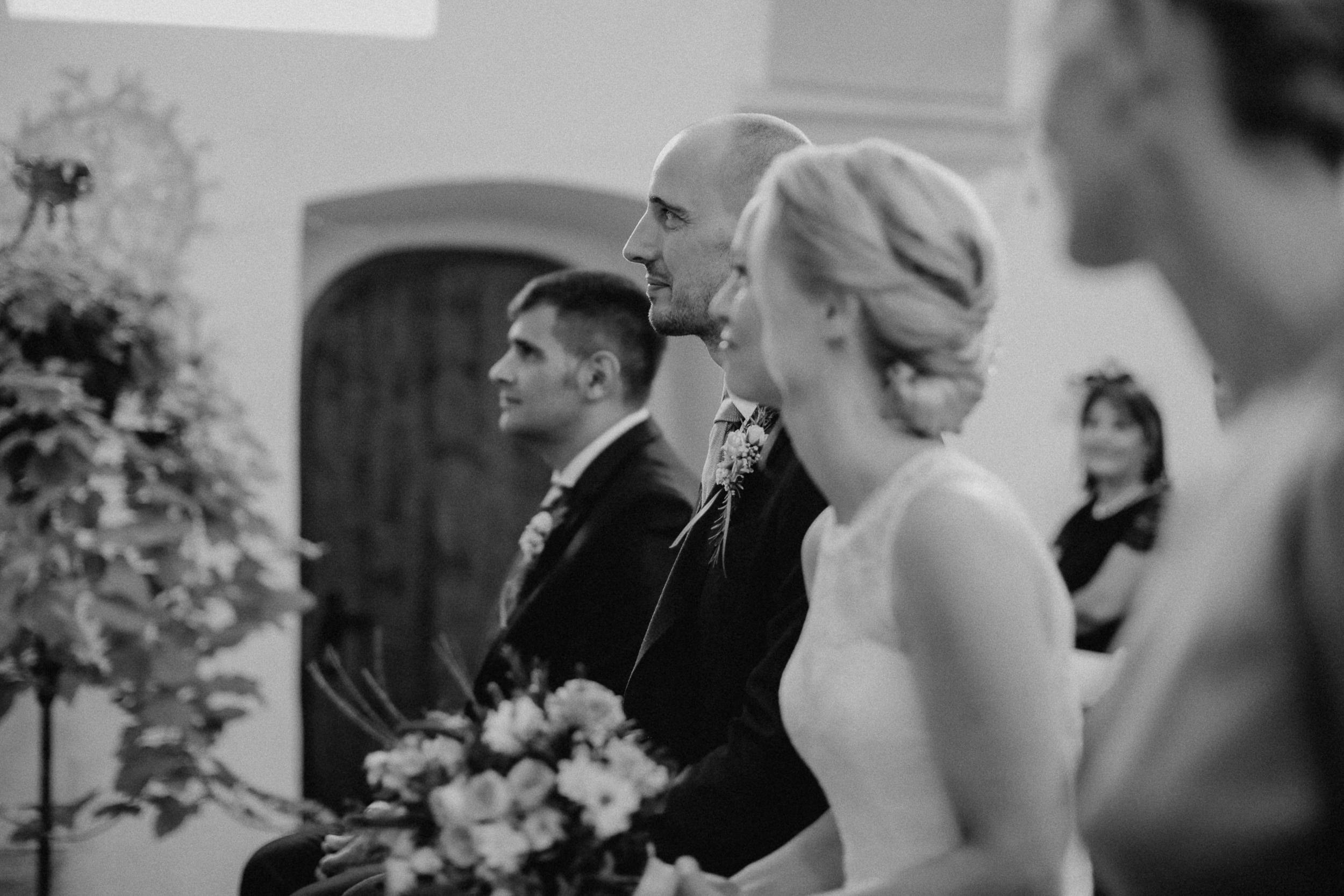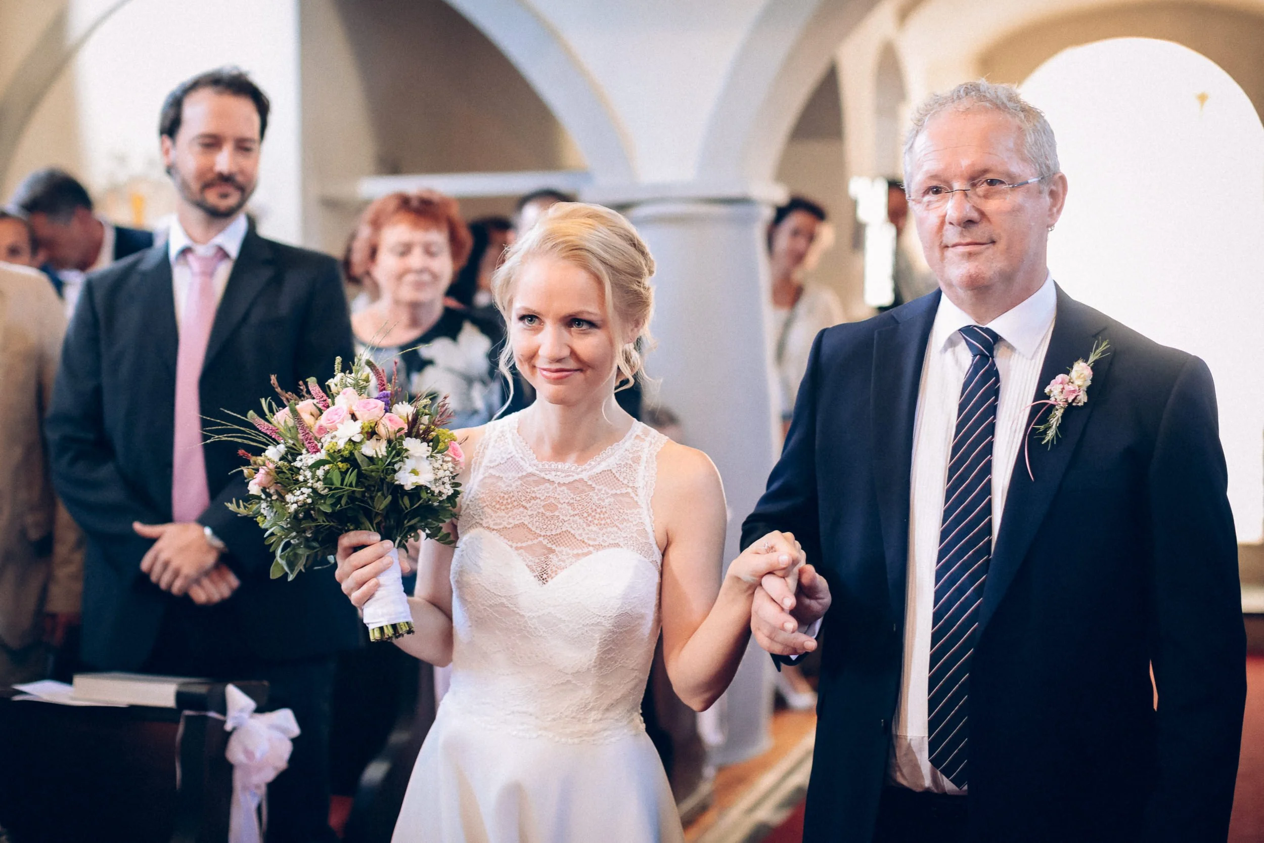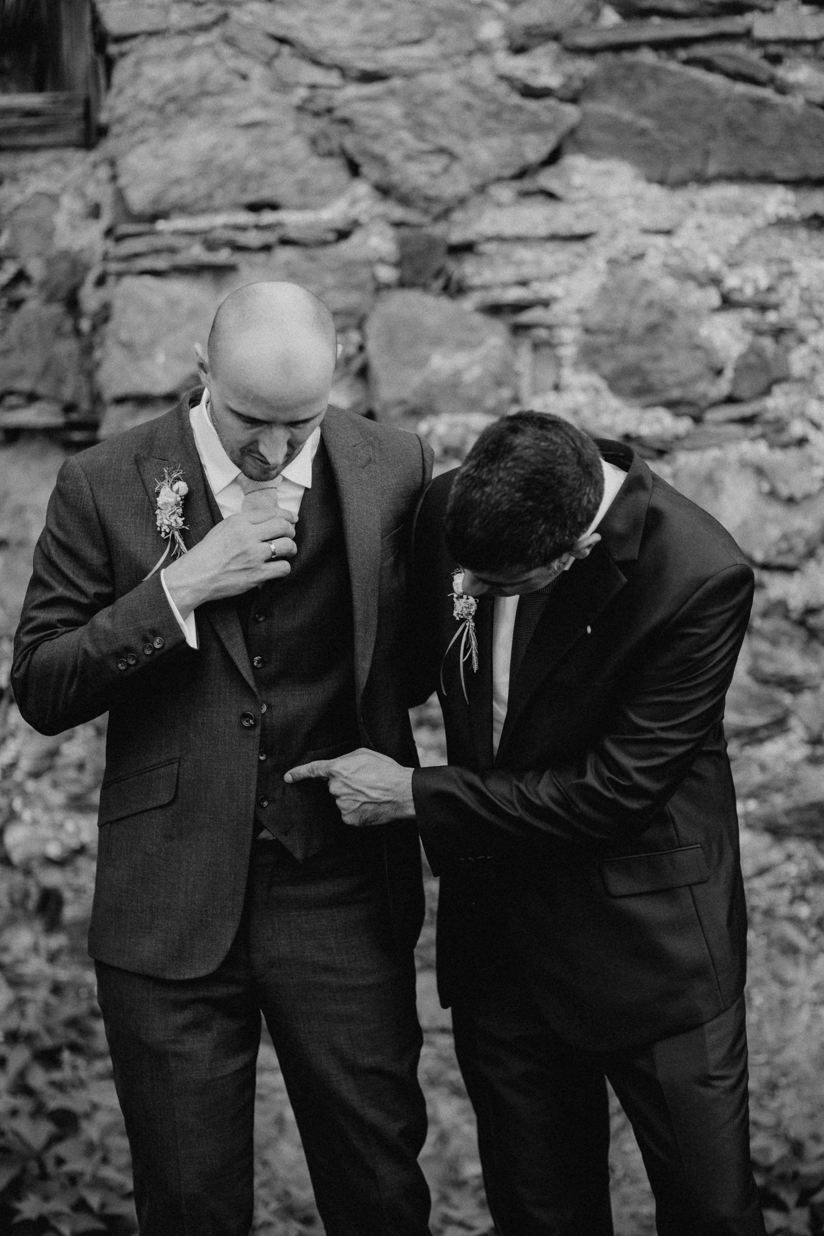 Auf geht’s um Brautstyling: Lockenwickler rein, Trockenhaube, es folgt kunstvolles Drapieren echter und unechter Haare. Das Ergebnis kann sich sehen lassen! Wieder zurück im idyllischen Dorf der Trauung: Braut und Bräutigam schlüpfen in die Outfits. Alle Knöpfe gehen zu – ein Erfolgserlebnis! Und schon geht es zum „First Look“ im romantischen Garten. Ein besonderer Moment abseits der Gäste, die bereits eintrudeln und auf der Sonnenterrasse einen Aperitif zu beschwingter Bläsermusik nehmen. Auch das Brautpaar gesellt sich schon vor der kirchlichen Trauung dazu. Nicht alltäglich, aber eine gute Idee! Es entspannt ein wenig vor dem großen Auftritt in der Kirche und lässt Braut und Bräutigam an der schönen Stimmung teilhaben.