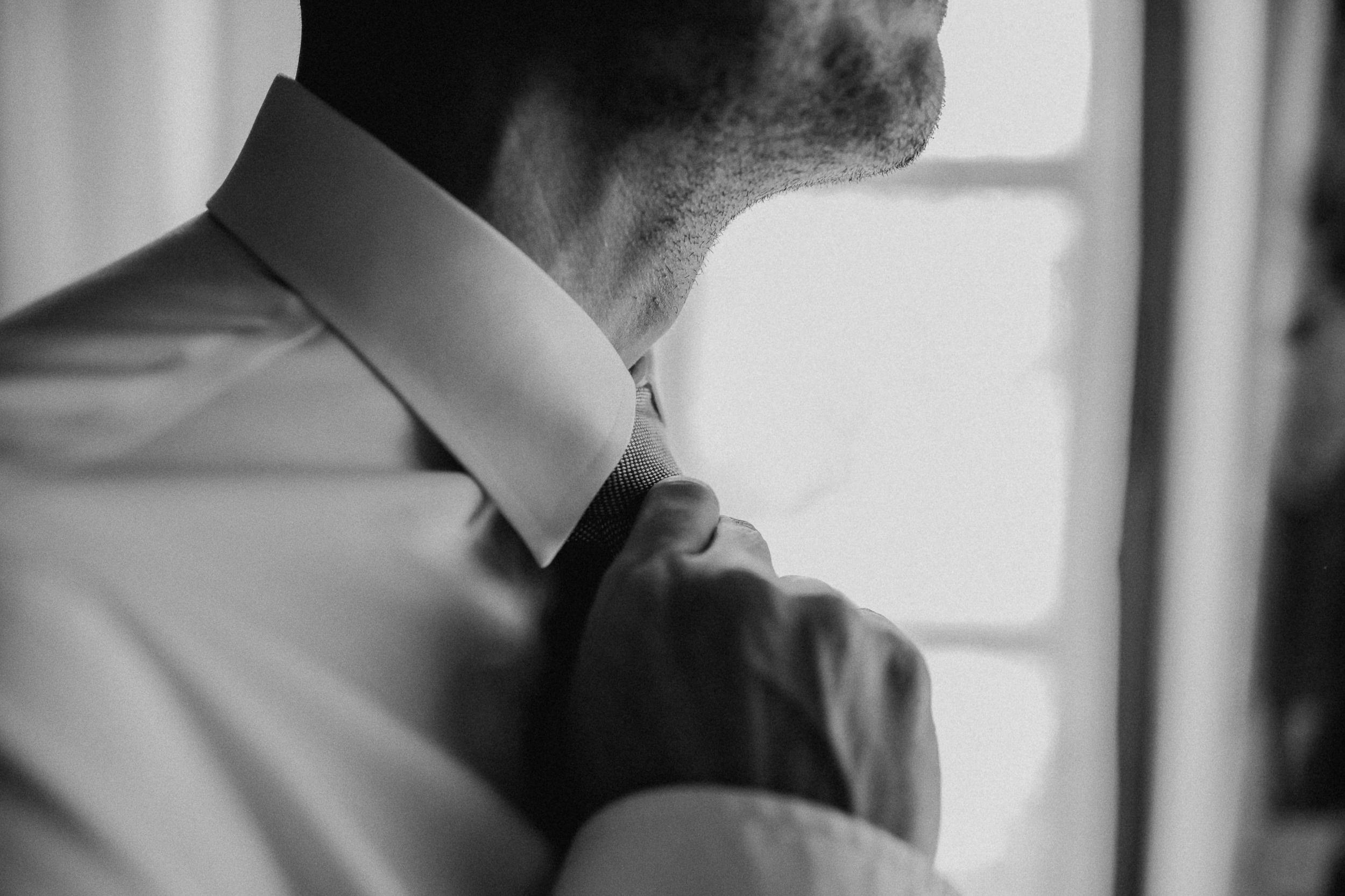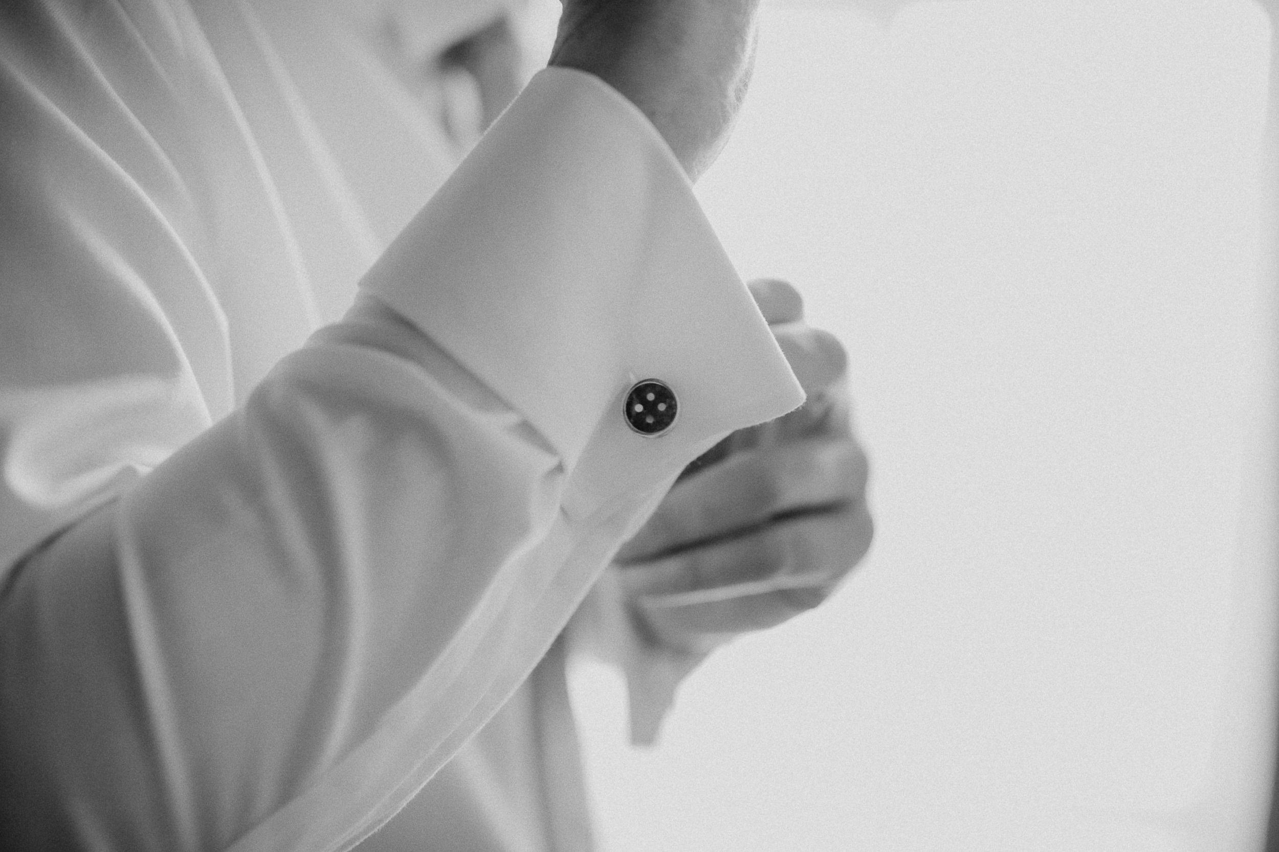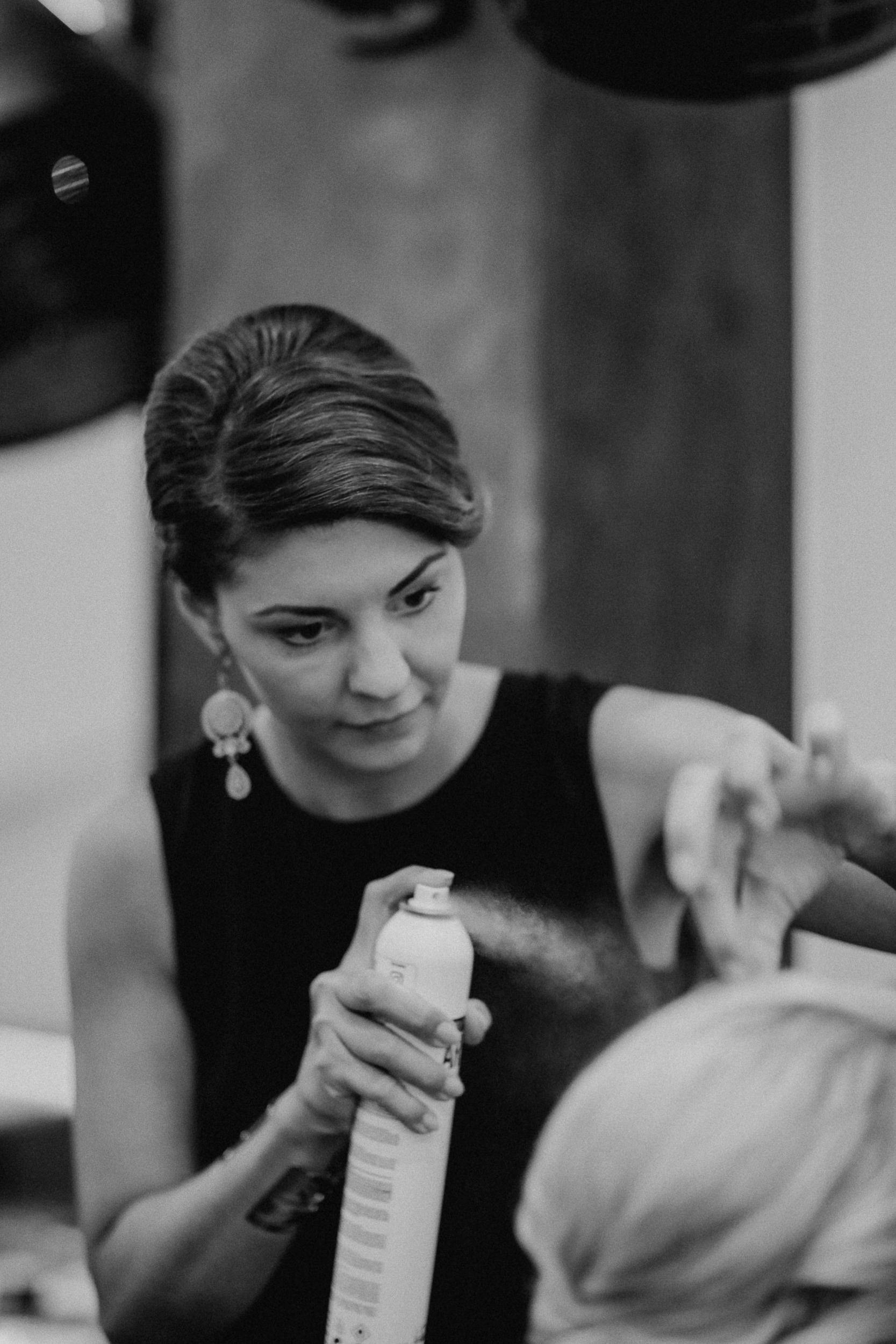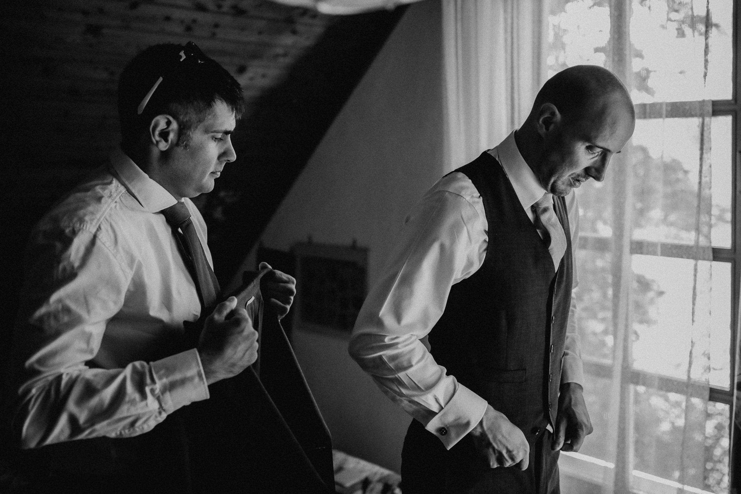 Auf geht’s um Brautstyling: Lockenwickler rein, Trockenhaube, es folgt kunstvolles Drapieren echter und unechter Haare. Das Ergebnis kann sich sehen lassen! Wieder zurück im idyllischen Dorf der Trauung: Braut und Bräutigam schlüpfen in die Outfits. Alle Knöpfe gehen zu – ein Erfolgserlebnis! Und schon geht es zum „First Look“ im romantischen Garten. Ein besonderer Moment abseits der Gäste, die bereits eintrudeln und auf der Sonnenterrasse einen Aperitif zu beschwingter Bläsermusik nehmen. Auch das Brautpaar gesellt sich schon vor der kirchlichen Trauung dazu. Nicht alltäglich, aber eine gute Idee! Es entspannt ein wenig vor dem großen Auftritt in der Kirche und lässt Braut und Bräutigam an der schönen Stimmung teilhaben.